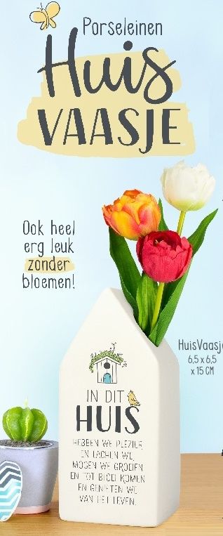 Het hele jaar door maken bloemen mensen blij! Speciaal hiervoor is het Huisvaasje ontworpen. Dit frisse en vrolijke bloemenvaasje heeft de vorm van een huisje en is met zijn rustieke uitstraling ook erg leuk als decoratie voor zowel binnen als buiten. De gezellige en sfeervolle teksten maken het Huisvaasje een fraai cadeau voor iedere gelegenheid!